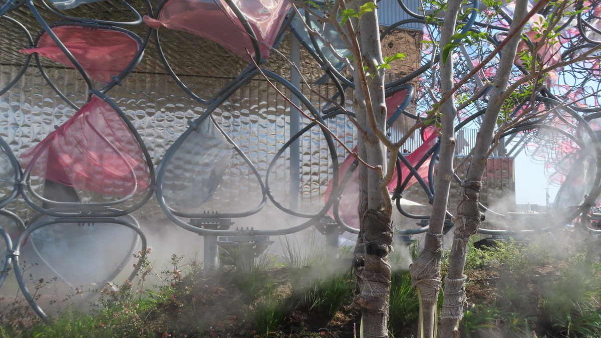 ミストではありませんが、フューチャーゾーンのフューチャーライフヴィレッジ内のビオトープ(5月訪問分)も、同じ冷却装置を有していまして、こちらは貯水でもって、自然の力で冷やす仕組みで、これまた異なります。