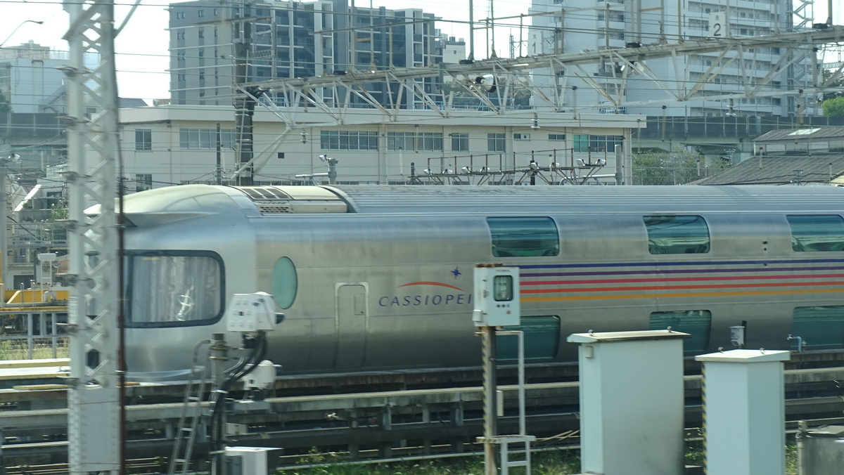 途中の尾久駅(JU03)では、かつての東北本線の寝台特急で活躍していた『カシオペア号』(E26系)の客車がホーム横の車両基地留置線に停まっていました。現在は臨時運行のカシオペア紀行号での運転があるとの事で、JR東海・JR西日本の285系『サンライズ瀬戸・出雲号』の夜行運用とは対称的に、昼行運用となっています。